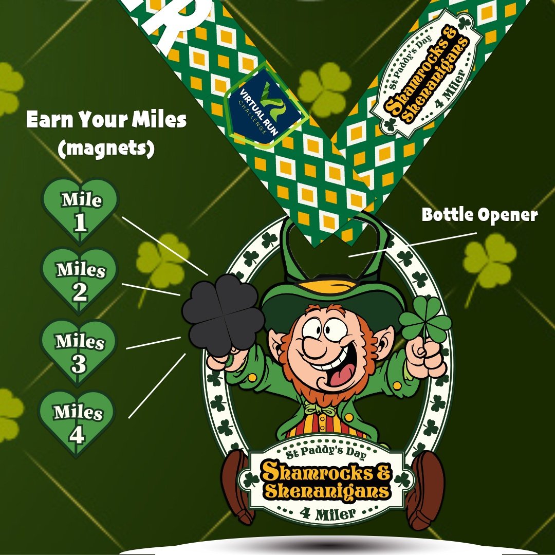 The Shamrocks & Shenanigans Virtual 4 Miler is a run or walk event that can be completed in a location and time of your choice. Participants have the option to complete the entire 4 miles at once or break up the distance into 4 - 1 mile segments.